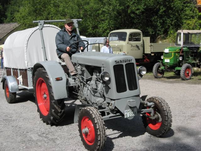 Es war wieder soweit, die persönlichen Einladungen vom Medebacher Club kündigten es ja schon kurz vorher an: das größte Trecker- und Oldtimertreffen des Jahres stand vom 11. bis 13. September bevor. Im Vorfeld hofften alle Treckerfahrer auf wenigstens einigermaßen schönes Wetter, doch gleich vorweg – man wurde doch ein wenig enttäuscht. Es war durchweg trübe und besonders am Sonntag von oben nass. Aber das dem Medebachern anzukreiden, wäre falsch, man hatte dort eine gewohnt professionelle aber lockere Veranstaltung aufgebaut. Einige Nuttlarer mit „festem Dach“, zwei Hanomag AL 28er, reisten bereits am Freitagnachmittag an, um auch schon die Plätze für die restliche Truppe abzustecken. Diese gesellte sich zumeist erst am Samstagnachmittag nach und nach dazu: zwei Eicher-, ein Hanomag- und ein Schlütertraktor. Allesamt mit passendem Wohnanhänger inklusive Proviant in fester und flüssiger Form. So gerüstet konnte man den Rest des Samstags gut überstehen, ohne auf die örtliche Infrastruktur am Festgelände zurückgreifen zu müssen. Doch das tat man dann doch nicht so ganz, schließlich muß auch der Medebacher Verein über Einnahmen verfügen, denn der hat ja auch, wie jeder andere Club, Auslagen auf der Veranstaltung. Diese waren bestimmt nicht unbeträchtlich , da eine original englische Dampflokomobile mit Stromgenerator vor Ort die ganze Zeit in Betrieb war. Diese lief auch am Abend in voller Lichterpracht, wie man das von Dorset gewohnt war. Zudem wurden tagsüber natürlich Pflugvorführungen sowie Holzbearbeitung vorgestellt. So mancher konnte auch die Kraft seines mehr oder weniger starken Traktors am Baumstamm erproben. Die Odltimeraustellung bot einen guten bis fast kompletten Überblick über die gesamte Bandbreite der zumeist in Deutschland gebauten Traktoren der 40er, 50er, 60er und 70er Jahre. Vieles stand sogar nicht nur einfach bunt nebeneinander, sondern war nach Marken geordnet, und wie immer in ordentlichen Reihen hintereinander. Leider war diesesmal keine Sonderausstelleung einer einzelnen Marke dabei, dafür aber teils auch anderes landwirtschaftliches Gerät, wie kleine selbstfahrende Mähdrescher oder was die Bauern sonst noch so in Gebrauch hatten. Im Automobilen Bereich sah man nicht ganz so viele Fahrzeuge wie sonst die Jahre, was aber am durchwachsenen Wetter gelegen haben könnte. Dafür fuhren die Medebacher aber zusätzlich zum Augenschmaus einen kullinarischen auf: den Kartoffeldämpfer in der Größe einer Lokomobile! Auch die anderen Genüsse leiblicher Art konnten befriedigt werden, es gab die obligatorischen Würstchen-, Pommes-, Kuchen- und Bierstände die auch gut besucht waren. Am Sonntagmorgen erfreute zudem ein kostenloses Frühstück die vom Vortag übernachtenden Aussteller, wobei gegen eine kleine Spende nichts einzuwenden war. Doch noch einmal zurück zum Samstagabend und der musikalischen Darbietung in Form einer tüchtigen Rockband. Diese war enorm laut und vom melodischen Unterhaltungswert derart deplaziert, dass so mancher Treckerfan dachte er sei in Woodstock und in Gefahr schwerhörig zu werden! Da stellte man sich die berechtigte Frage nach dem Sinn eines Rockbandkonzerts auf einer Trecker- und Oldtimervorführung, an der ja weitaus mehrheitlich ältere Semester in den Fahrerlagern vertreten sind. Diese, und nicht nur die Nuttlarer, kehrten dann auch dem Spektakel frühzeitig den Rücken und an den heimischen Campingofen zurück. Doch fairerweise muss gesagt werden, dass das gesamte Treffen gut organisiert und trotz des widrigen Wetters auch ordentlich Zuschauer fand. Man hatte sich von Seiten der Veranstalter erkennbar Mühe gegeben, die leider nur in einem Punkt zuviel des Guten war – dem musikalischen! Autor: B. Schmidt