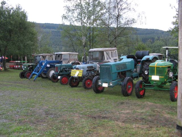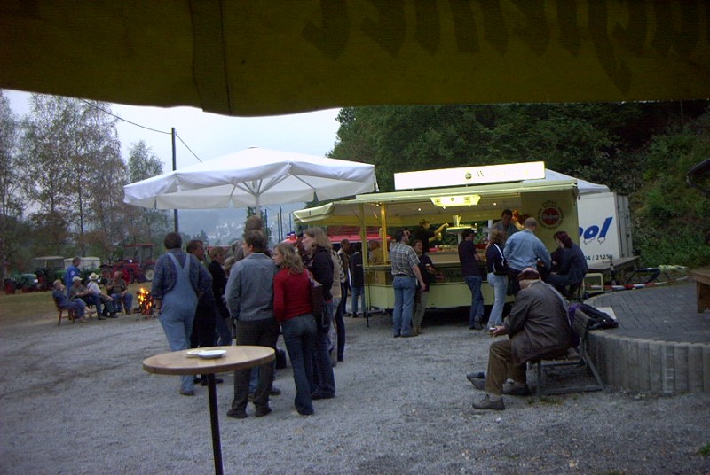In fast schon gewohnter Mannschaftsstärke zogen die Nuttlarer Trecker- und Oldtimerfreunde am Samstag bei sehr durchwachsenem, aber trockenem Wetter in Richtung des schönen Ortes Harth bei Büren im Paderborner Land. Die Route führte über Brilon – Scharfenberg erst einmal bis kurz vor Brilon – Alme, von wo die Landstraße links Richtung Büren abzweigte. Der weitere Verlauf führte über eine mäßig befahrene Strecke die sich entlang des Flüsschens Alme im gleichnamigen Tal entlang schlängelte. Eine landschaftlich sehr reizvolle Gegend. Ungefähr 4 Kilometer gefahren sah man schon den Ort Harth auf Bergeshöhe in Reichweite, als es galt, die einzig wirkliche Steigung dorthin in Angriff zu nehmen. Doch diese Wegstrecke nahmen die berggewohnten Nuttlarer mit Bravour, sodaß nach kurzer Zeit das von weitem ersichtliche mit einem am Autokran hängenden Traktor kenntlich gemachten Festgelände erreicht war. Diese erstreckt sich am Ortsanfang der gemütlichen Ortschaft Harth rund um den Bauernhof Rüsing. Obwohl die Bezeichnung „Festgelände“ zumindest für die Ausstellungsfläche aufgrund des vorhandenen lehmigen Stoppelfeldes etwas übertrieben erschien, so haben die dort veranstaltenden Schützenbrüder sich aber mit dem Rest des Areals sichtlich Mühe gegeben. Um den Bauernhof Rüsing herum gruppierten sich gutbestückte Getränke-, Imbiss-, Süßigkeiten und Kuchenstände, um die Aufmerksamkeit der Gäste ebenso auf sich zu ziehen, wie die dort zudem noch aufgestellten automobilen Klassiker. Leider spielte das Wetter am besagten Samstagabend nicht so ganz mit, denn es begann nach der sehr langsamen Dorfrundfahrt der Oldtimer doch merklich zu regnen. Das war aber nicht weiter schlimm, denn das obligatorische „Nachdieseln“ zu später Stunde bot dank gut ausgewählter Musik von der Scheibe und ebenso interessanten Gesprächen genug Kurzweil. Doch erging es den Nuttlarern wahrscheinlich genauso wie vielen anderen Campern – der Abend war noch jung, und man verlängerten denselbigen um weitere Stunden nach Mitternacht im eigenen Mannschaftszelt. Auf natürliche Art und Weise unterstützten dabei zudem einige Alkoholika den positiven Gemütszustand soweit, daß sich ein gewisser, nicht mehr zu überbietender, geistiger Erkenntnisstand einstellte. Leider haperte es dann an der körperlichen Fitness um diesen Zustand länger zu ertragen, und man trollte über den mittlerweile verschlammten Platz dem ersehnten Bette zu. Die Nachtruhe war also einigermaßen kurz und das kostenlose Frühstück der Harther wartete in ausreichendem Maße auf die noch müden Gesellen. Manch ein Nuttlarer wagte den nicht sehr kurzen Weg zur Frühstückskantine nicht, und genoss das Brötchen unter der eigenen Stoffplane. An diesem folgenden Sonntag ließen die Veranstalter eine wirklich tolle Bayern – Revivalband aufspielen, dieses mal in rund 10 köpfiger Anzahl und ziemlich perfekt. Zusehens füllte sich der Platz vor dem Bauernhof mit Besuchern, die mal hier verweilend, mal aufs „Festgelände“ pendelnd ihre Runden zogen. Auch letztgenanntes Areal wurde mehr und mehr hauptsächlich von Treckeroldtimern beackert. Einer der ältesten, ein Lanz Bulldog, von 1929, aber auch einige Youngtimer wie z.B. diverse Hanomags der letzten Baujahre. Es gab wirklich schönes zu sehen, auch das schon vielbesprochene Wetter besserte sich, es blieb den Rest des Tages von oben trocken. Eine nette Überraschung erlebte der Autor dieser Zeilen, er bekam im Rahmen einer Bewertung der schönsten Oldtimer, sogar durch TÜV – Mitarbeiter am Platz durchgeführt, den 3. Platz für seinen MAN vom Baujahr 1952. Nicht nur der Pokal blieb eine schöne Erinnerung, auch das Fest insgesamt und die nette Atmosphäre, auch unter den Nuttlarern, machte schon wieder Lust auf ein nächstes Mal in Büren – Harth zum Oldtimertreffen in 2 Jahren. Echt empfehlenswert! Autor: B. Schmidt